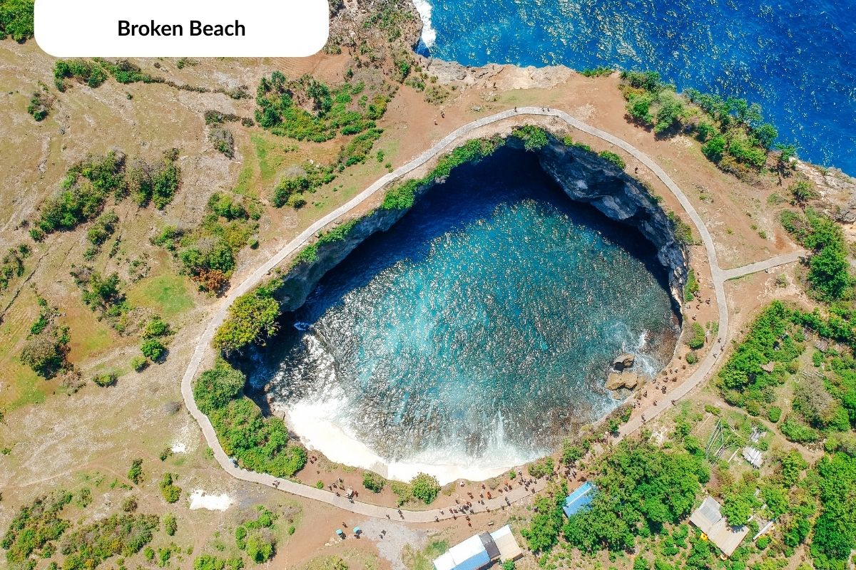 Broken Beach atau Pasih Uug dalam bahasa lokal adalah salah satu keajaiban alam Nusa Penida yang wajib dikunjungi. Formasi tebing melingkar dengan lubang besar alami yang langsung menghadap laut lepas menciptakan pemandangan spektakuler. Air laut biru jernih yang masuk melalui lubang tebing ini membentuk laguna alami yang menakjubkan, menjadikannya destinasi ini wajib masuk ke paket wisata Nusa Penida Barat paling unik.